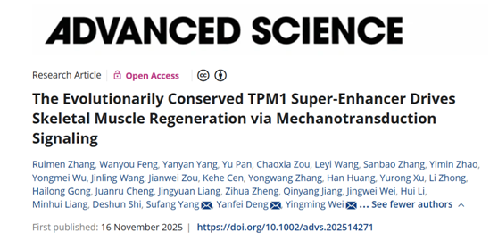 近日,我校动物科学技术学院动物生殖调控与遗传改良团队在牛骨骼肌发育研究领域取得重要进展,该研究揭示了表观遗传调控与细胞机械力学如何协同调控牛肌肉干细胞(MuSCs)分化及肌肉发育的机制。成果以“The Evolutionarily Conserved TPM1 Super-Enhancer Drives Skeletal Muscle Regeneration via Mechanotransduction Signaling”为题,在国际知名期刊《Advanced Science》(IF5-year =15.6)发表。论文的第一作者为动科学院助理教授张瑞门,通讯作者为农发院教授韦英明、动科学院教授邓彦飞及杨素芳,广西大学为该论文的第一完成单位。