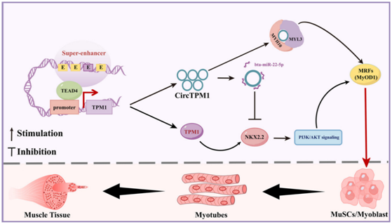 牛肉作为全球公认的重要动物蛋白来源,具有显著的经济价值,在保障全球粮食安全和消除贫困方面发挥着关键作用。骨骼肌再生是一个高度协调的过程,依赖于MuSCs的定向分化能力。超级增强子作为关键的表观遗传调控元件,能够高效驱动细胞命运决定基因的表达。本研究通过跨物种(牛、小鼠、人)基因组数据分析,该首次揭示了TPM1基因超级增强子(TPM1_SE)在骨骼肌再生中的核心、保守性作用,阐明了其通过整合表观遗传调控与细胞机械力学信号,协同促进肌肉生成的新机制。该研究不仅深化了对肌肉生成机制的理解,也为肌肉退行性疾病治疗和畜牧业肉质改良提供了新的理论依据和潜在靶点。
