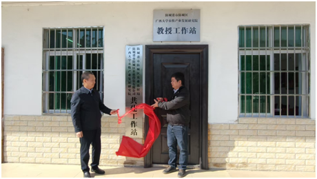 (广西大学农牧产业发展研究院副书记李明与防城区副区长禤立鑫共同为教授工作站揭牌)