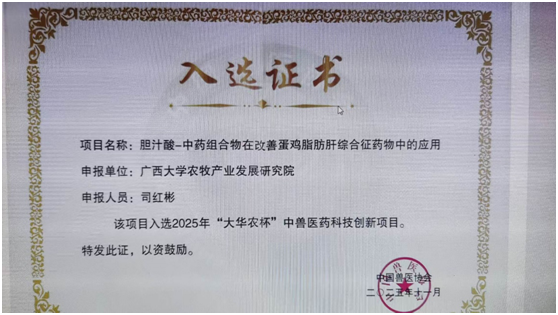 同时,两项聚焦蛋鸡健康养殖的技术成果入选2025年“大华农杯”中兽医药科技创新项目:“鸡骨草黄酮对黄曲霉素B1诱导蛋鸡肝损伤的治疗技术方案”,依托鸡骨草的保肝护肝功效,针对性解决养殖中黄曲霉素污染导致的蛋鸡肝脏损伤难题,为禽蛋安全生产筑牢防线;“胆汁酸-中药组合在改善蛋鸡脂肪肝综合征药物中的应用”,创新采用复合配方破解蛋鸡脂肪肝高发痛点,兼顾疗效与安全性,符合绿色养殖发展趋势。