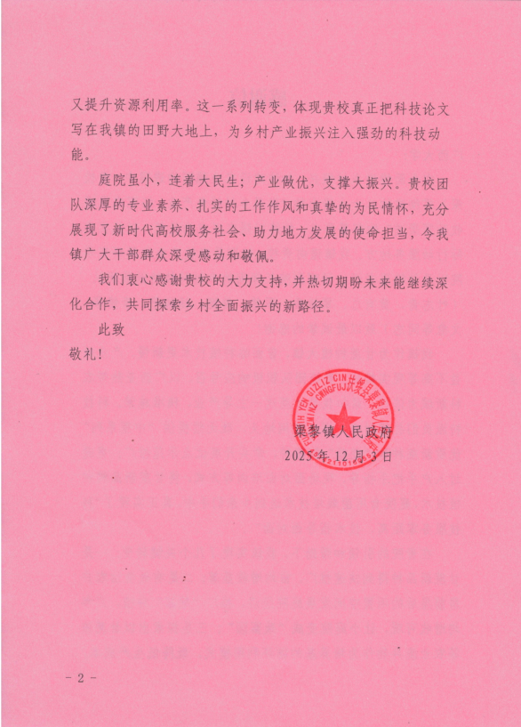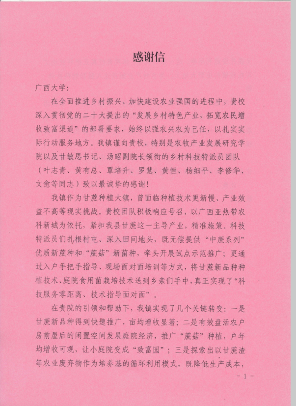 扶绥县渠黎镇人民政府给我校发来感谢信,感谢我院科技特派员团队。