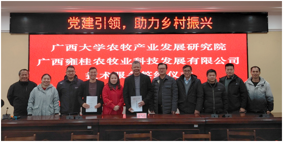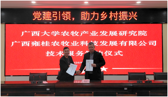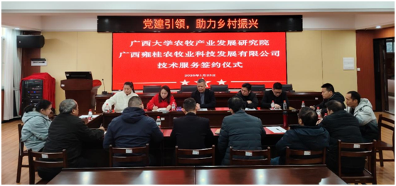 2026年1月23日,我院与广西雍桂农牧业科技发展有限公司技术服务合作签约仪式在广西大学圆满举行。本次签约以“党建引领,助力乡村振兴”为核心导向,旨在推动农牧产业科学化、标准化升级。签约仪式由我院二级教授、广西牛羊创新团队首席专家韦英明老师,草业发展中心项目负责人黄世洋,以及广西雍桂农牧业科技发展有限公司法人梁昌庆董事长、总经理梁超华等企业管理层代表共同见证,标志着双方合作的正式启动。